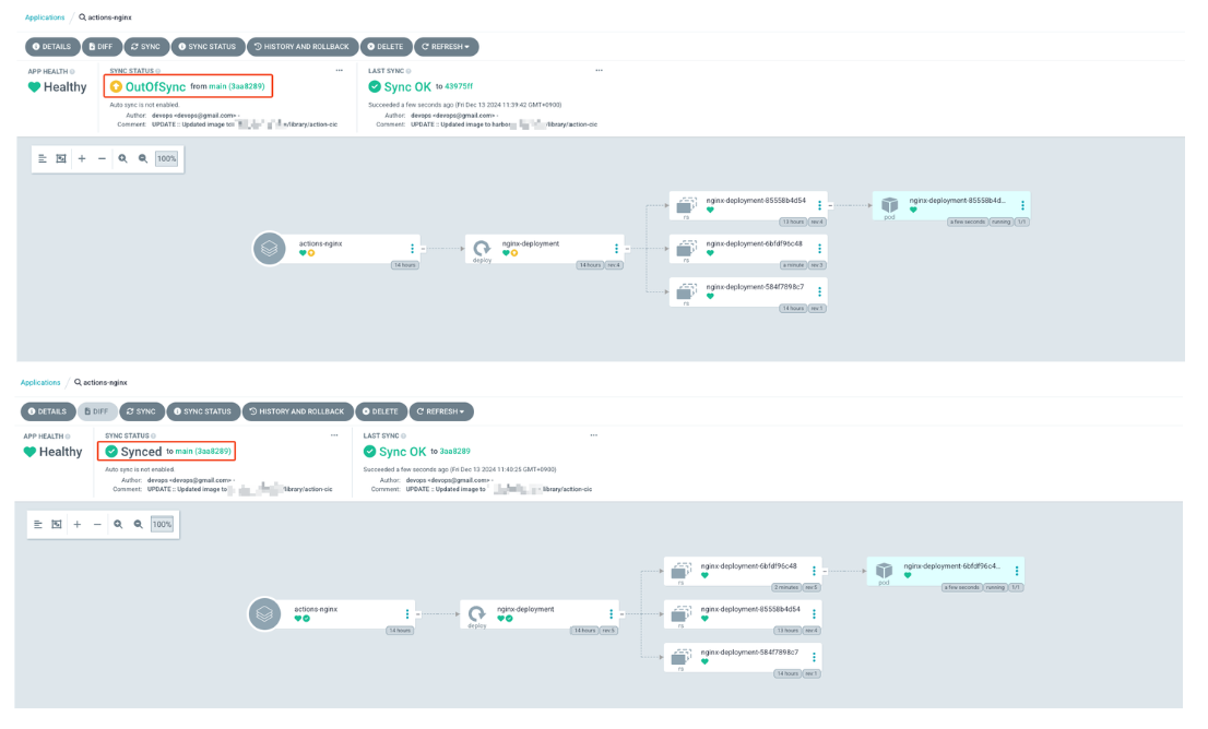 ArgoCD에서도 매니페스트 레포지토리의 변경 사항을 감지하고, 동기화(Sync)가 정상적으로 동작하는 것을 확인할 수 있다.