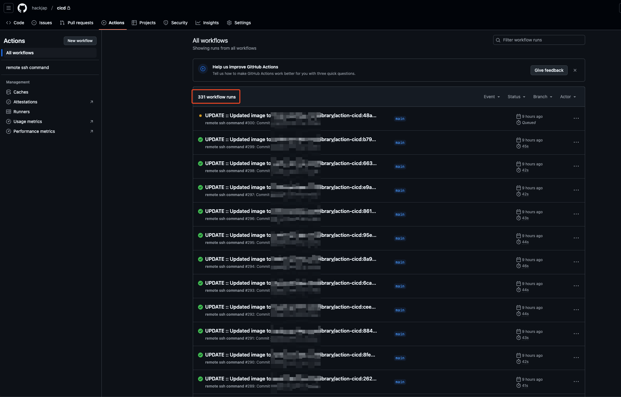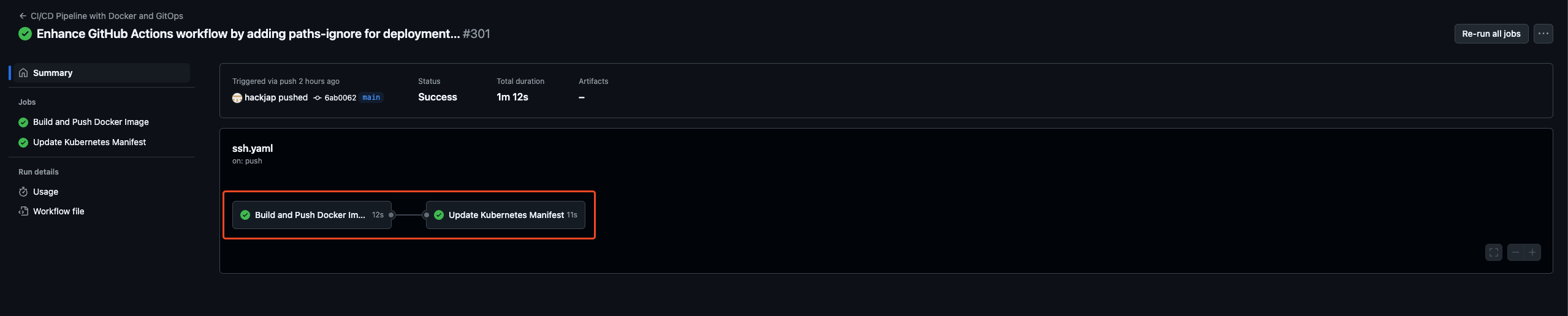 다음날 Github Actions 페이지를 확인해 보니 약 300개의 워크플로우가 실행되고 있었다. 원인을 파악해 보니, 워크플로우는 push 이벤트가 발생할 때 실행되도록 설정되어 있는데, 마지막 단계에서 매니페스트를 push하는 로직이 포함되어 있어, 무한 루프에 빠진 것이다. 실제 운영 환경이었다면 큰 문제가 발생할 뻔했다..