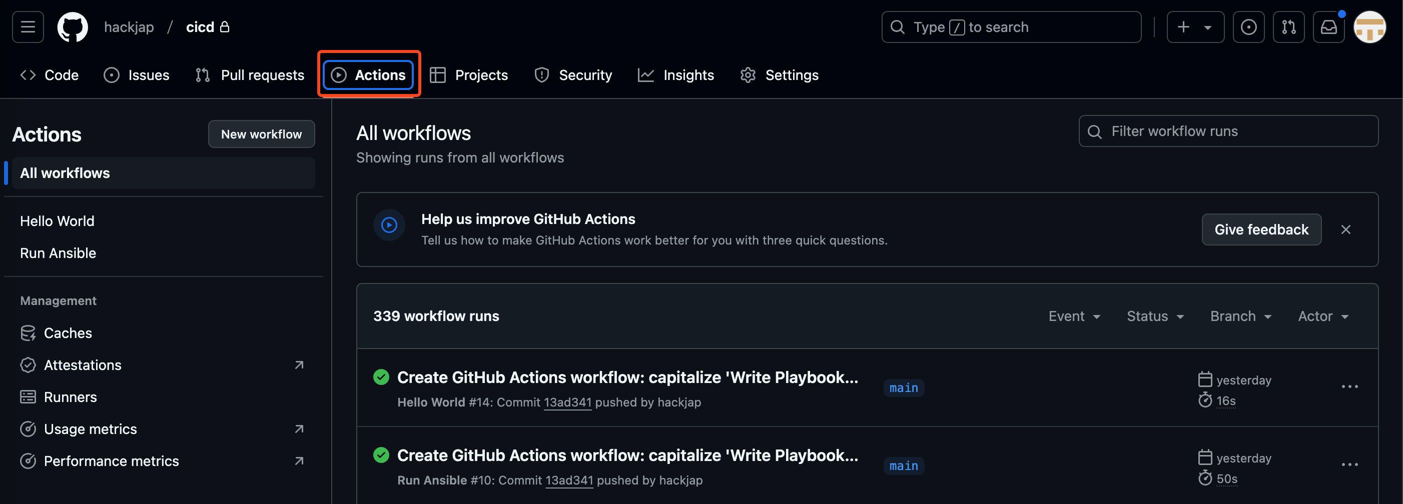 GitHub Actions를 Ansible과 같은 선언형 관리 도구와 연계하면, 서버 프로비저닝, 애플리케이션 배포, 구성 관리와 같은 작업을 자동화하고, CI/CD 파이프라인에 통합할 수 있다.예를 들어, Actions에서 Ansible Playbook을 실행하여 서버 환경을 설정하거나, 애플리케이션의 상태를 점검하고 업데이트하는 워크플로우를 손쉽게 구현할 수 있다