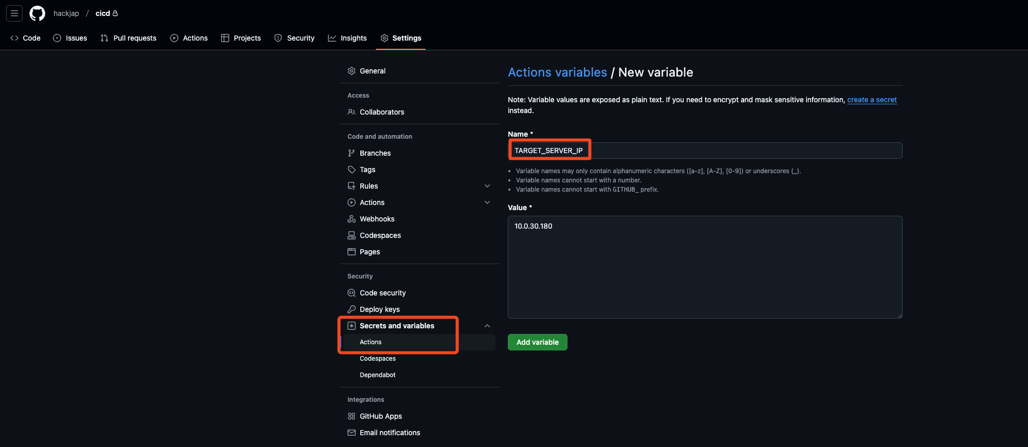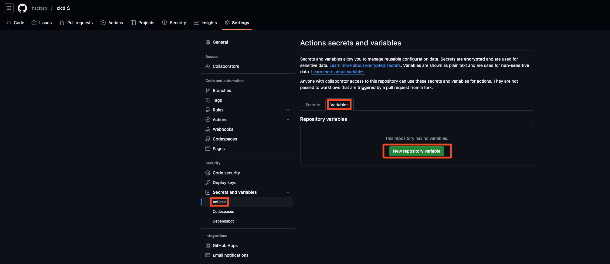 변수 등록 : Repostry > Settings > Secrets and variables > action 메뉴에서 variables를 설정한다.