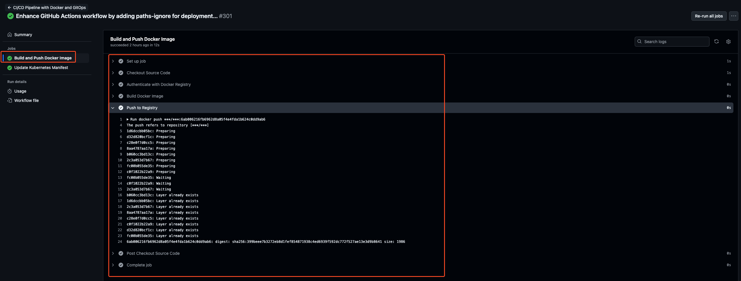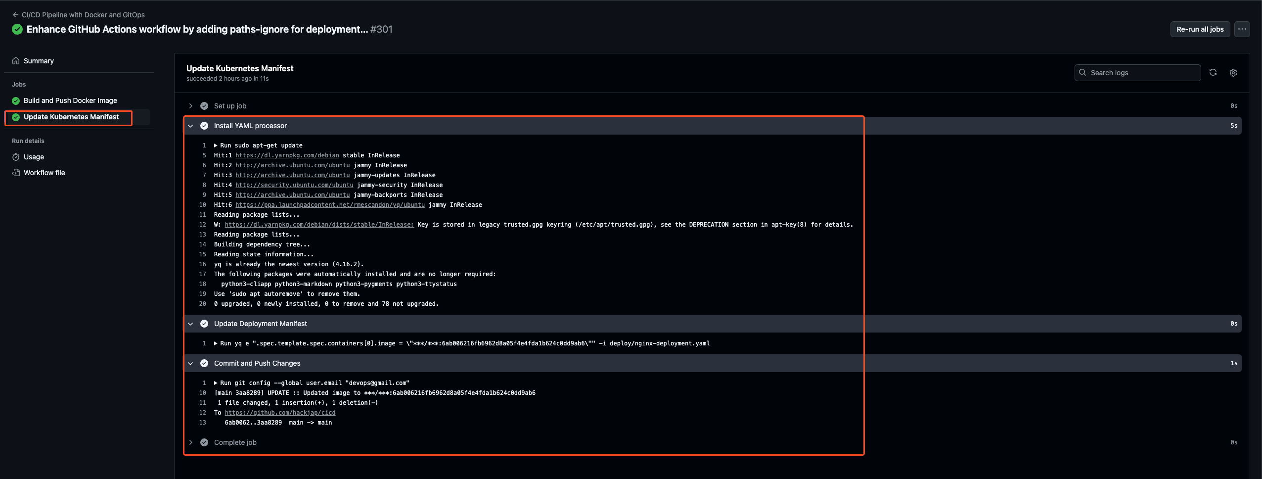 - yq를 사용해 쿠버네티스 메니페스트 파일의 이미지 태그를 새로 빌드된 Docker 이미지 태그로 업데이트