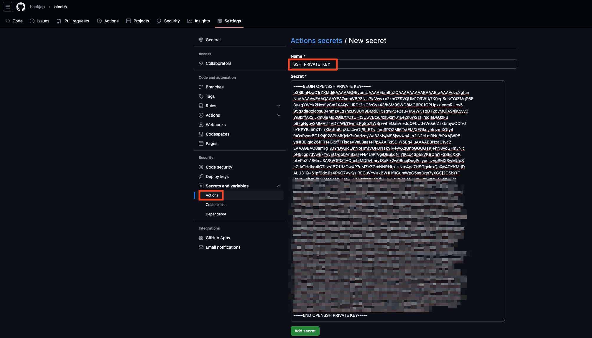 로컬에서 실행하기 때문에, GIthub에서 제공하는 Variables & Secrets를 사용하지 못하고, 직접 변수를 등록해주어야 한다. 시크릿으로 사용할 변수를 정의하는 파일을 생성한다.