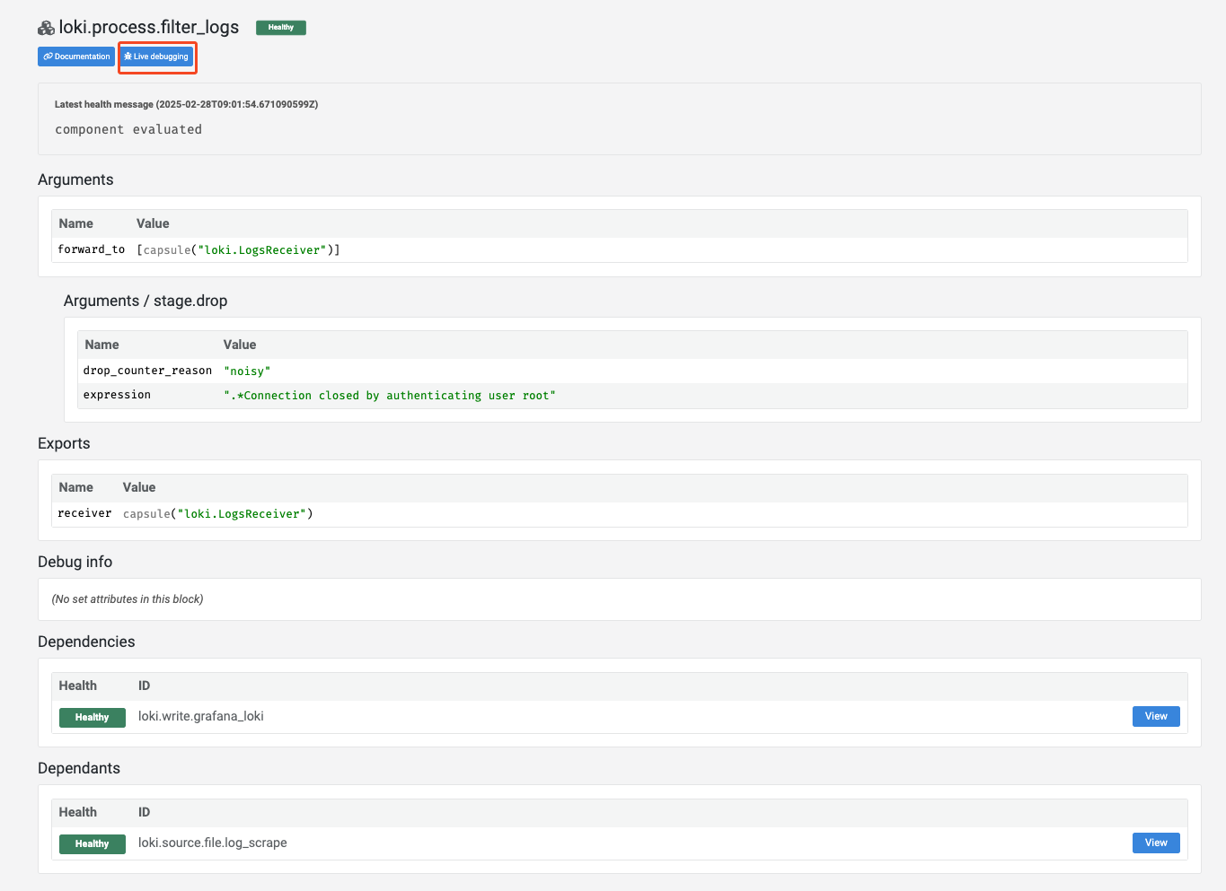 forward_to = [loki.write.grafana_loki.receiver] // 필터링된 로그를 Loki 전송 컴포넌트로 전달