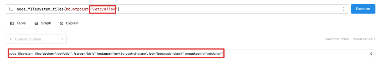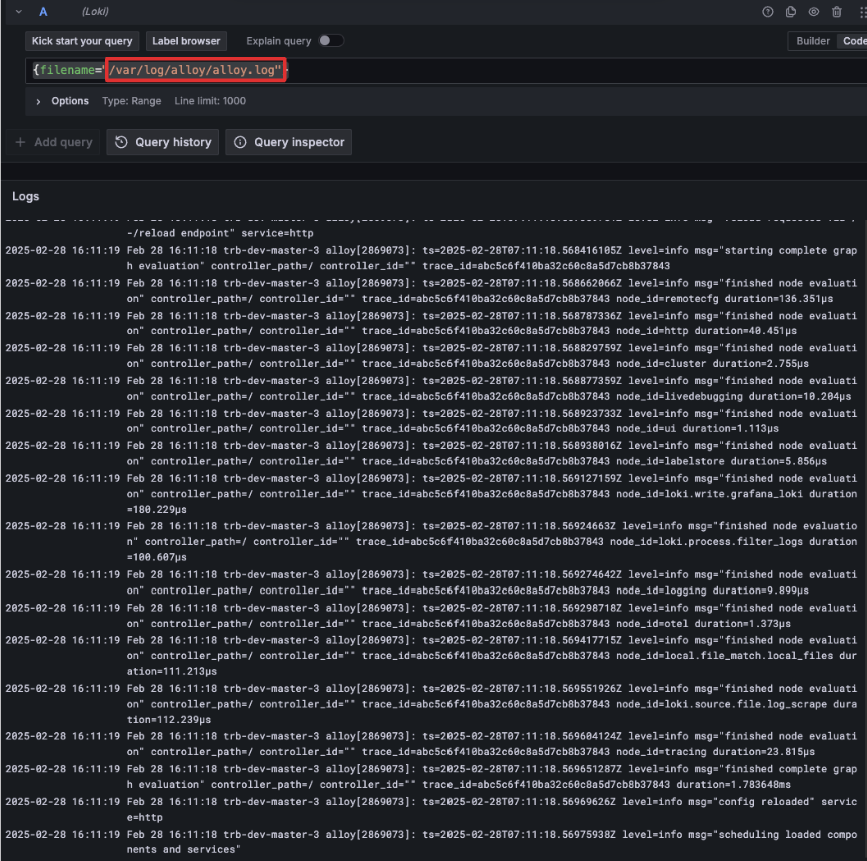 Alloy를 배포한 노드에서 수집한 Alloy 서비스의 로그 파일 및 내용을 그라파나에서 확인할 수 있다.