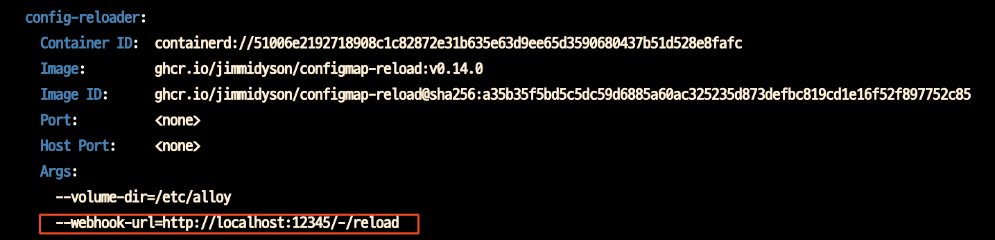 Grafana Alloy의 파드를 확인해 보면 컨테이너가 2개로 구성이 되어있는데 config-reloader라는 컨테이너를 통해 파드를 재시작하지 않고도 런타임에서 동적으로 설정을 적용할 수 있다(actuator refresh와 비슷). 플래그의 설정된 webhook-url을 통해 동작하는 것 같다.