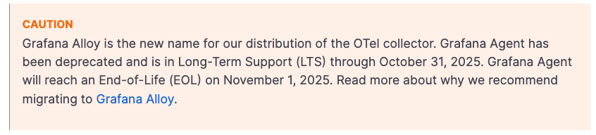 Grafana Agent에 대해 알아보려던 중, 공식 문서에서 경고 문구를 발견하였다. Grafana Labs에서 Grafana Agent를 대체하는 새로운 솔루션인 Grafana Alloy를 발표했다는 내용이었다. 이에 따라 자연스럽게 Grafana Alloy에 대해 알아보기로 하였다.