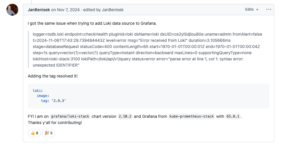 이 오류는 주로 Grafana와 Loki 간의 버전 호환성 문제로 발생한다. 특히 최신 버전의 Grafana와 이전 버전의 Loki를 함께 사용할 때 자주 발생하는 문제라고 한다. 이 문제를 해결하기 위해서는 Grafana 또는 Loki의 버전을 조정해야 하는데. 일반적으로 Loki의 이미지 태그를 변경하는 것이 더 간단한 해결책인 것 같다.