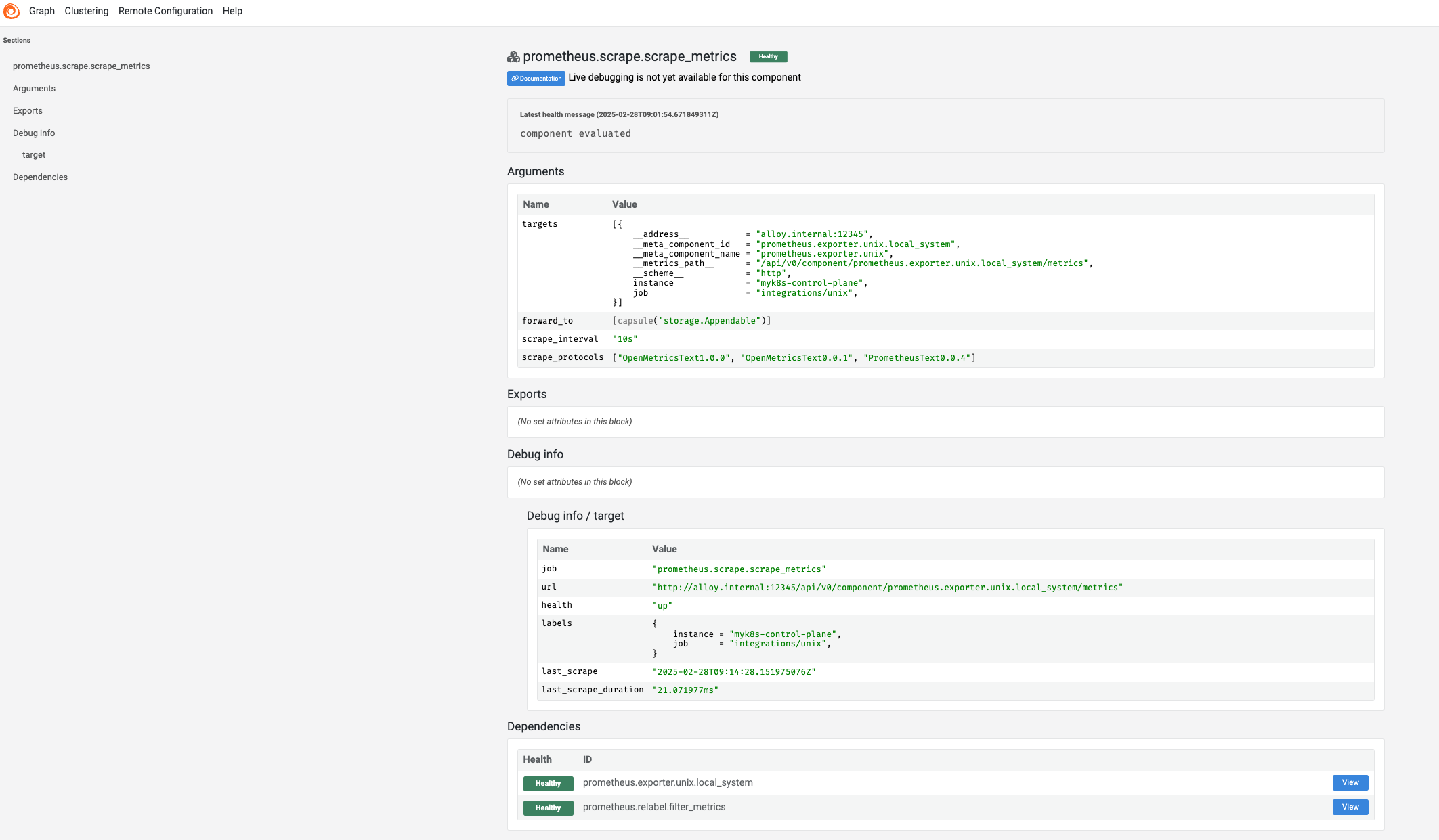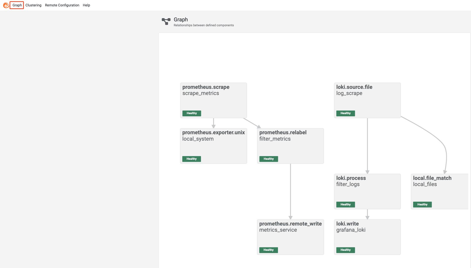 Grafana Alloy는 UI 대시보드를 제공한다. 컴포넌트 간의 종속성 관계를 그래프를 통해 시각화해서 보여주고, 각 컴포넌트들의 세부 구성정보나 데이터 흐름 등 복잡한 텔레메트리 파이프라인을 쉽게 이해할 수 있도록 도와준다.