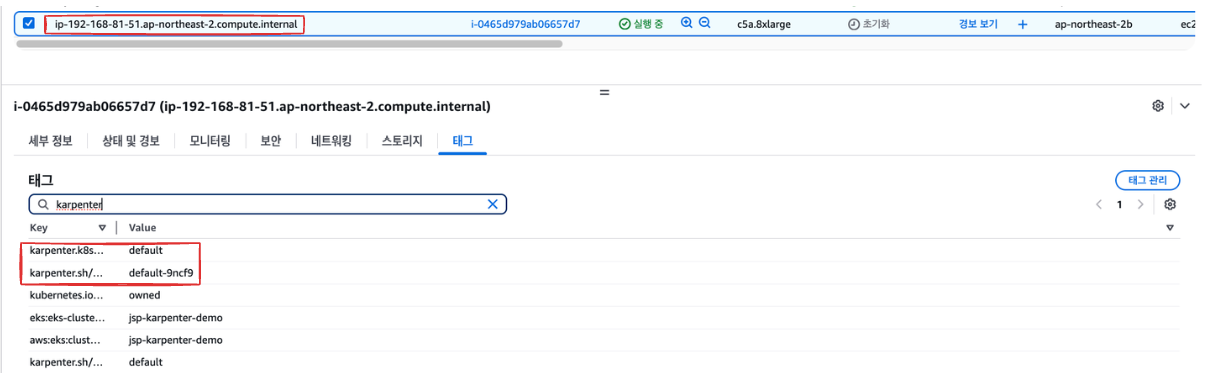 aws 콘솔에서 프로비저닝 된 EC2 인스턴스의 태그를 확인해 보면 karpenter 태그가 태깅되어 있음을 확인할 수 있습니다.