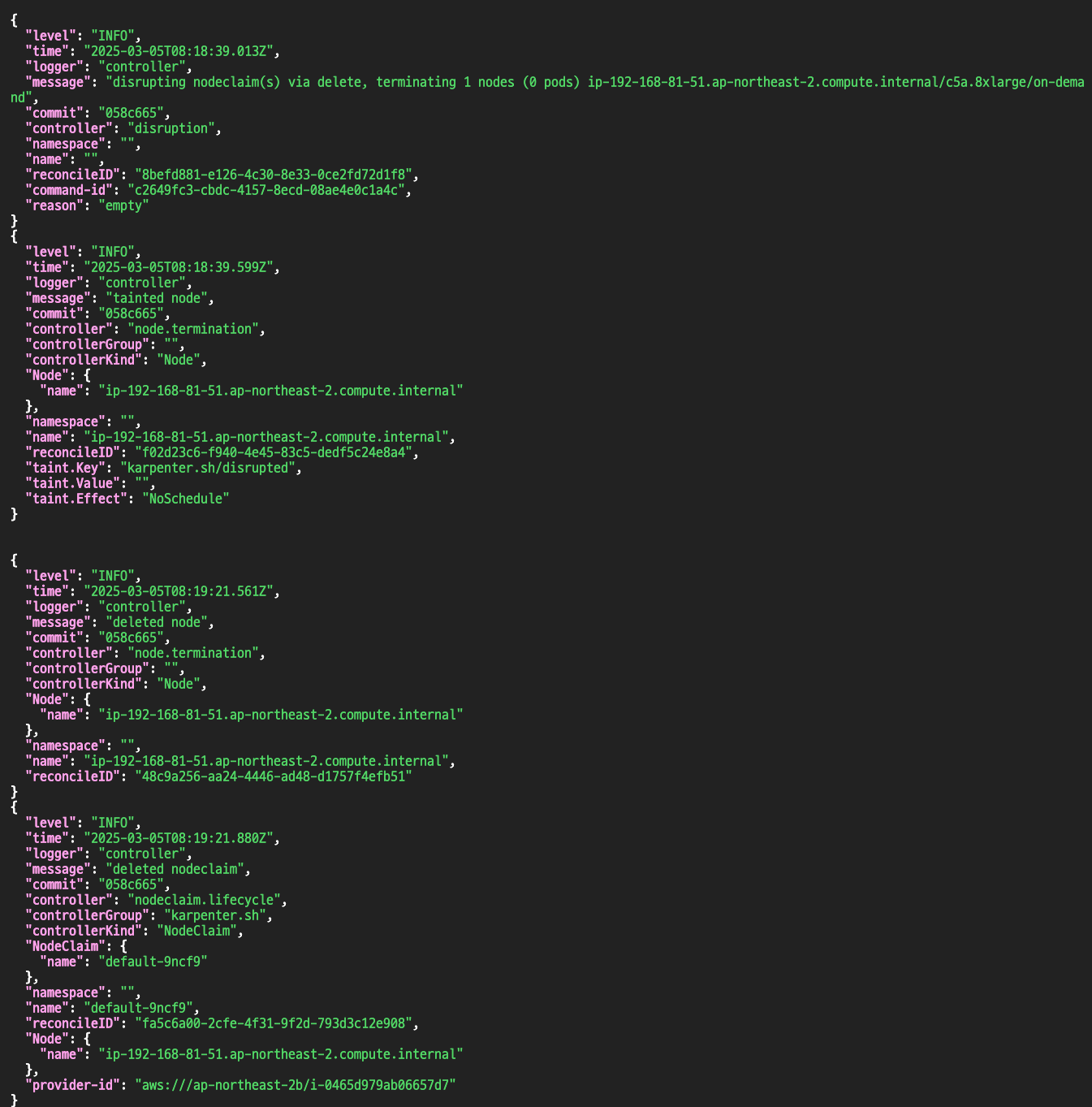 kubectl logs -f -n "${KARPENTER_NAMESPACE}" -l app.kubernetes.io/name=karpenter -c controller | jq '.'