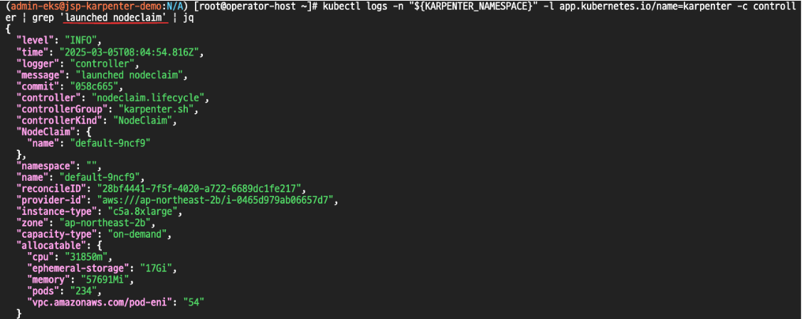 kubectl logs -n "${KARPENTER_NAMESPACE}" -l app.kubernetes.io/name=karpenter -c controller | grep 'launched nodeclaim'
