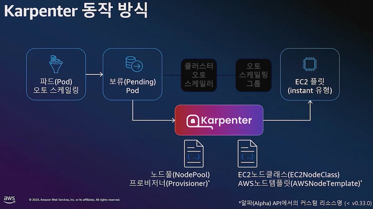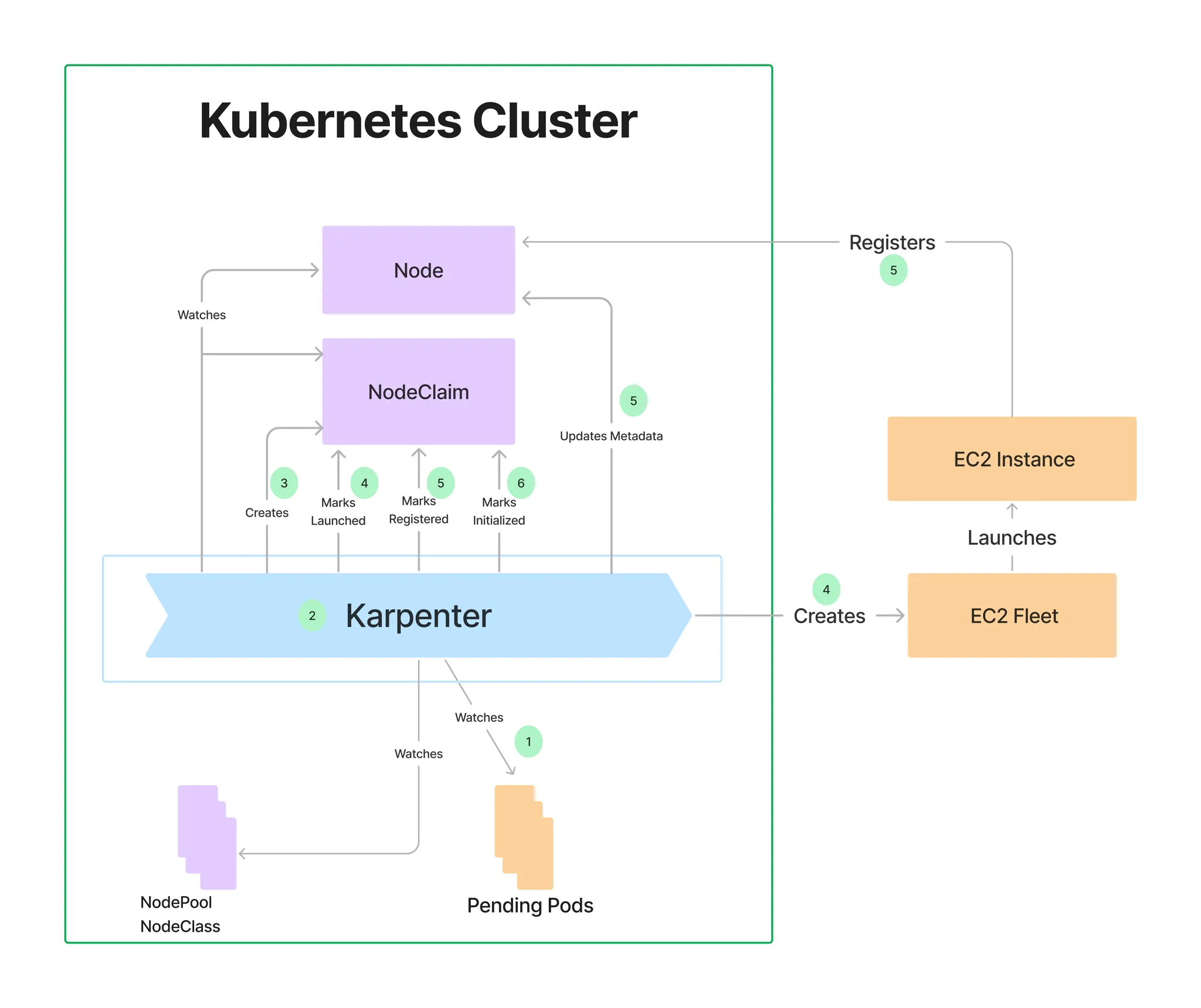 - Karpenter: Pending 파드 발견 → EC2 Fleet API 직접 호출 → 노드 생성 → 파드 스케줄링