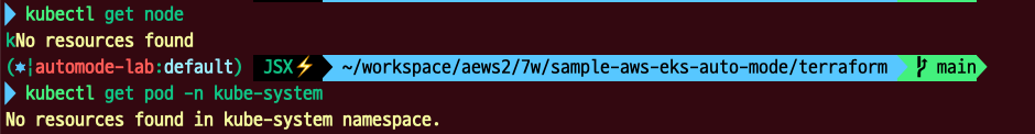 배포된 클러스터의 리소스를 확인해 보면 놀랍게도 아무것도 조회되지 않음을 확인할 수 있습니다. kube-system이나 addon과 같은 핵심 컴포넌트를 aws에서 데몬을 통해 관리가 되기 때문입니다.