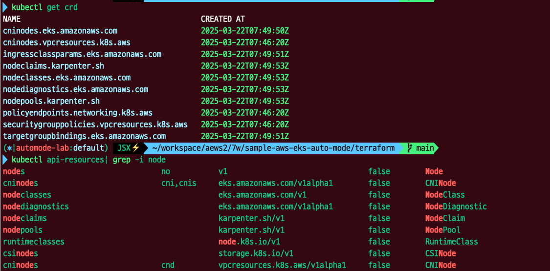 카펜터를 통해 노드를 관리하기 때문에 관련 crd들이 존재합니다. 또한 AutoMode는 노드에 접근할 수 없기 때문에 NodeDiagnostic과 같은 CRD를 통해 노드의 상태를 관리할 수 있는 기능들도 제공하는 것 같습니다.