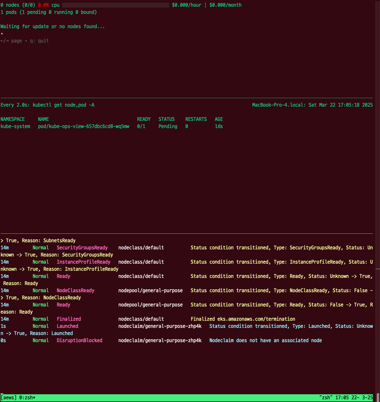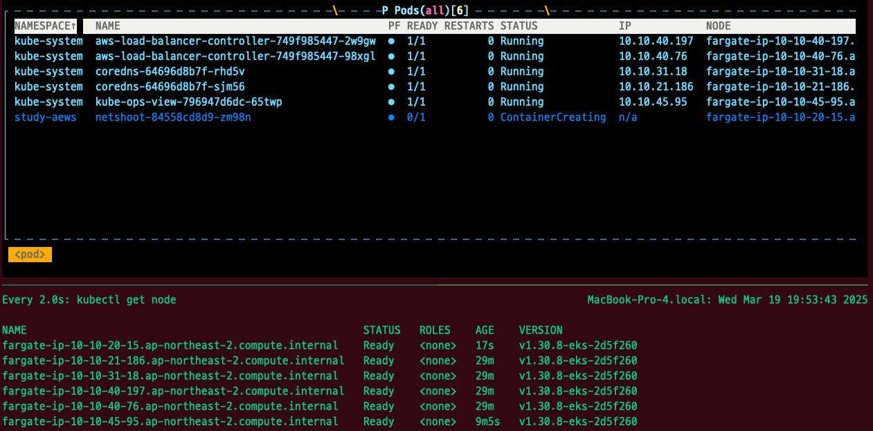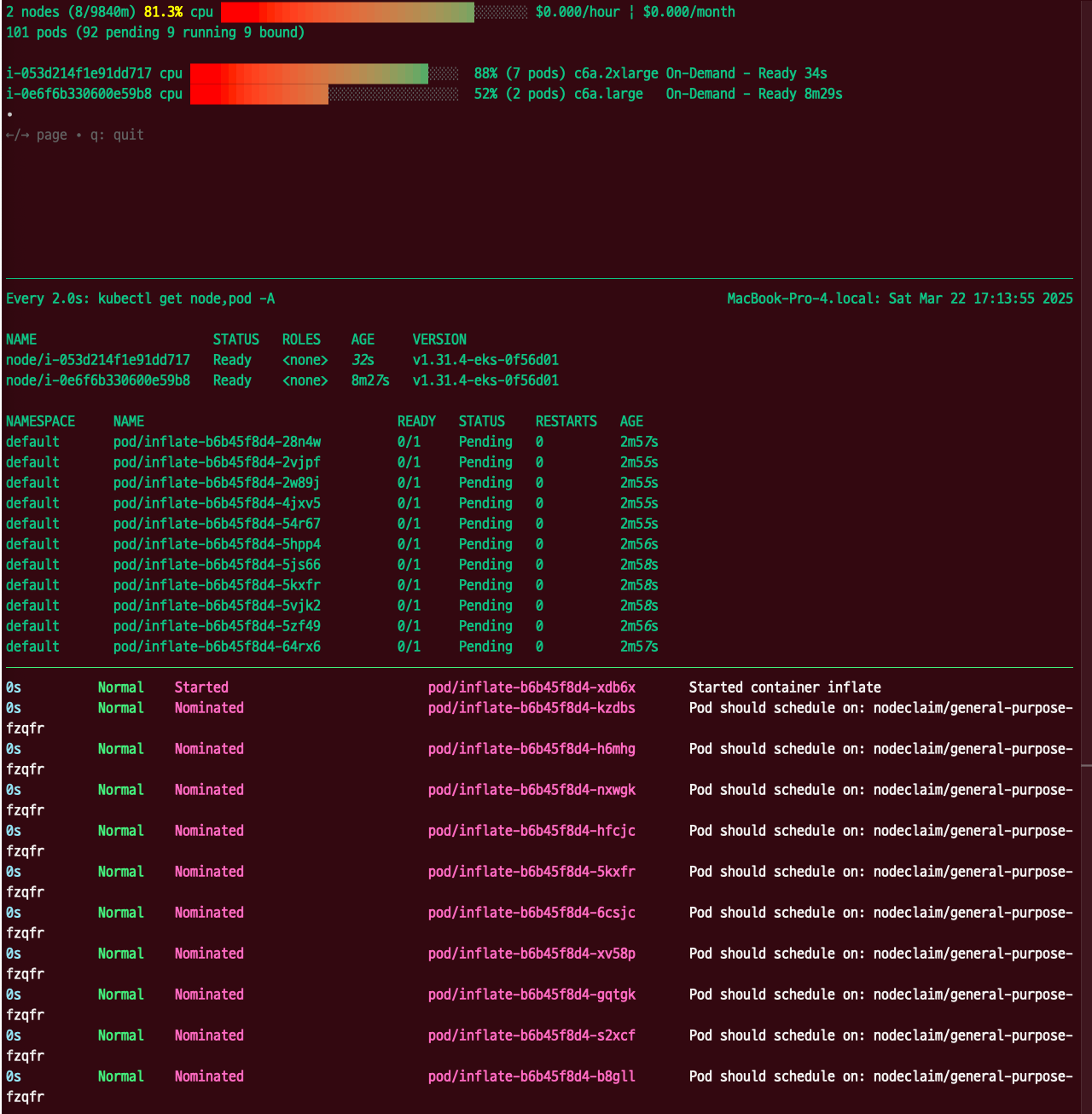 파드 생성 시, pending 상태이지만, Karpenter에 의해 노드가 프로비저닝 되면 파드가 스케줄링되는 것을 확인할 수 있다.