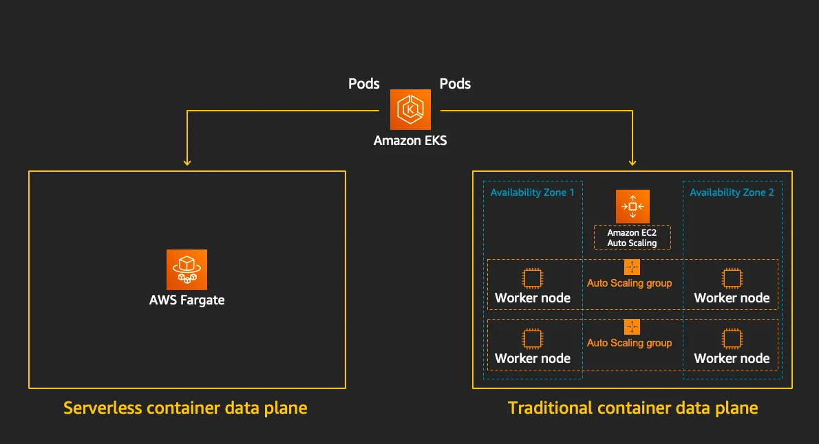 EKS Fargate는 AWS에서 제공하는 서버리스 Kubernetes 컴퓨팅 서비스입니다. 일반 EKS는 컨트롤 플레인만 AWS가 관리하지만, Fargate는 데이터 플레인까지 관리해 주므로 인프라 걱정 없이 애플리케이션 개발에 집중할 수 있습니다.