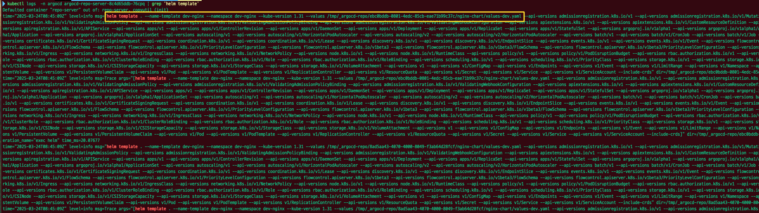 이를 뒷받침하듯, argocd-repo-server의 로그를 확인해 보면 각 애플리케이션에서 등록된 레포지토리의 차트를 helm template으로 렌더링 하는 과정을 볼 수 있었다..