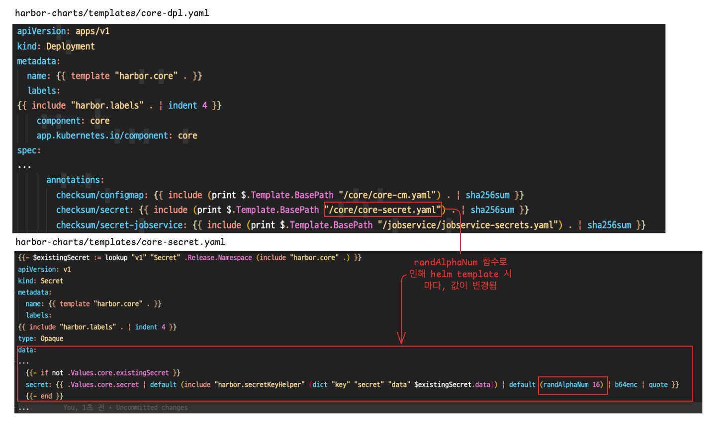 • Helm Chart 내 randAlphaNum과 같은 동적 랜덤 요소가 존재할 경우,