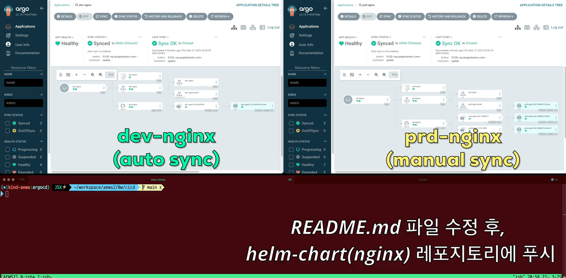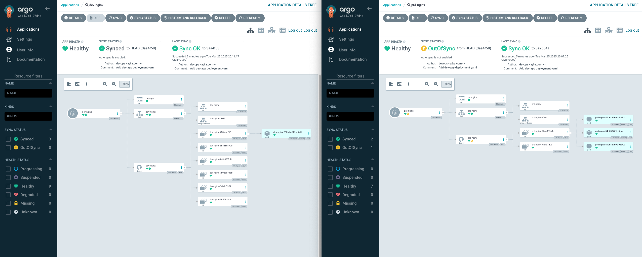 먼저, 서로 다른 환경(dev, prd)을 위한 두 개의 Nginx Helm Chart 기반 애플리케이션을 구성했다.