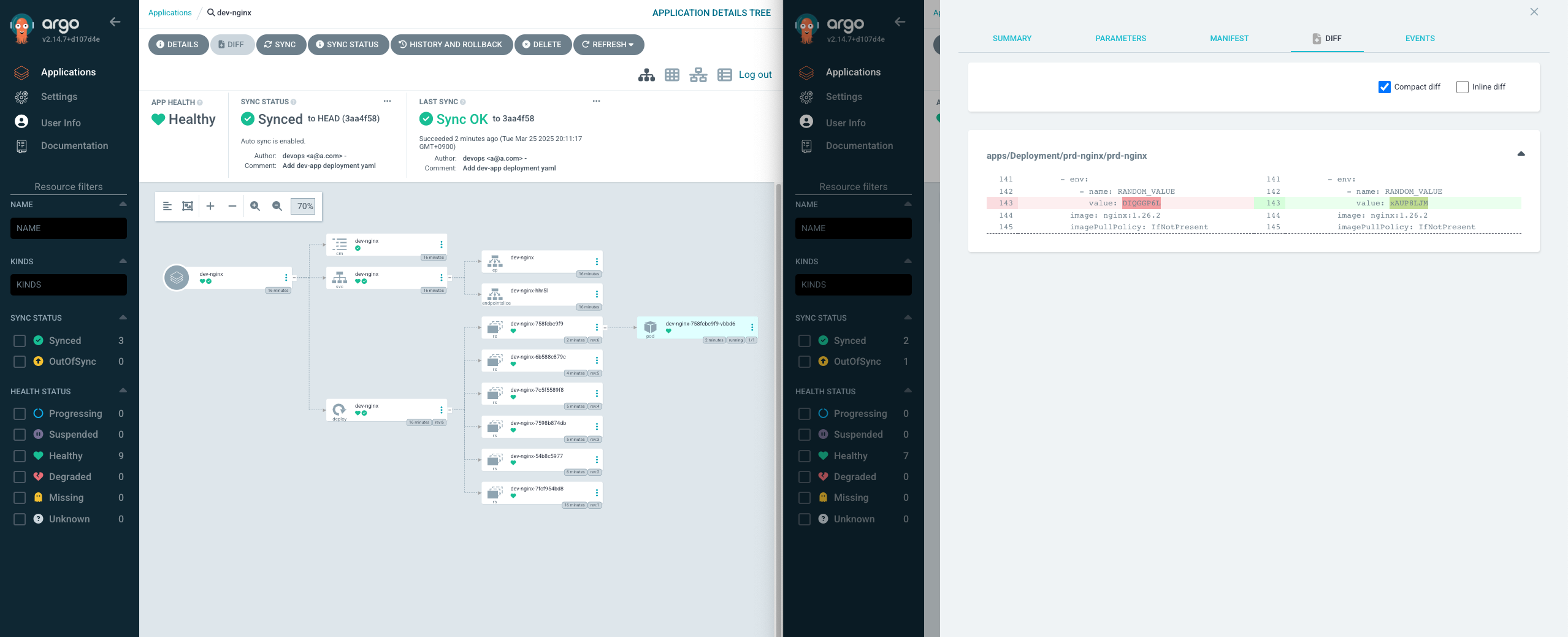 • ArgoCD는 이를 변경사항으로 감지 → 자동 동기화까지 수행하게 된다.
