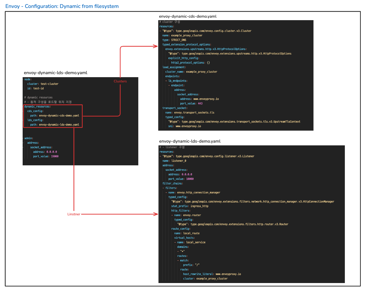 | LDS (Listener Discovery Service) | 특정 포트에서 Envoy가 수신 연결을 처리하는 리스너를 구성합니다 |