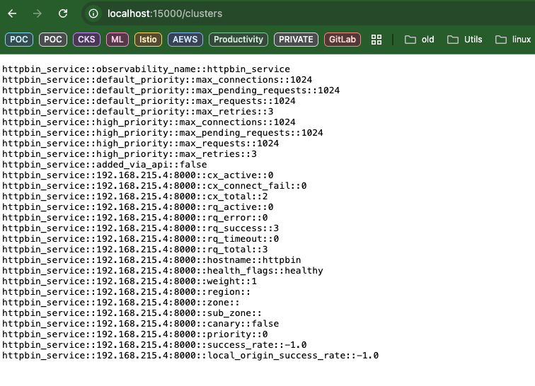 docker run -it --rm --link proxy curlimages/curl curl -X GET http://proxy:15000/clusters # 엔보이에 설정한 클러스터