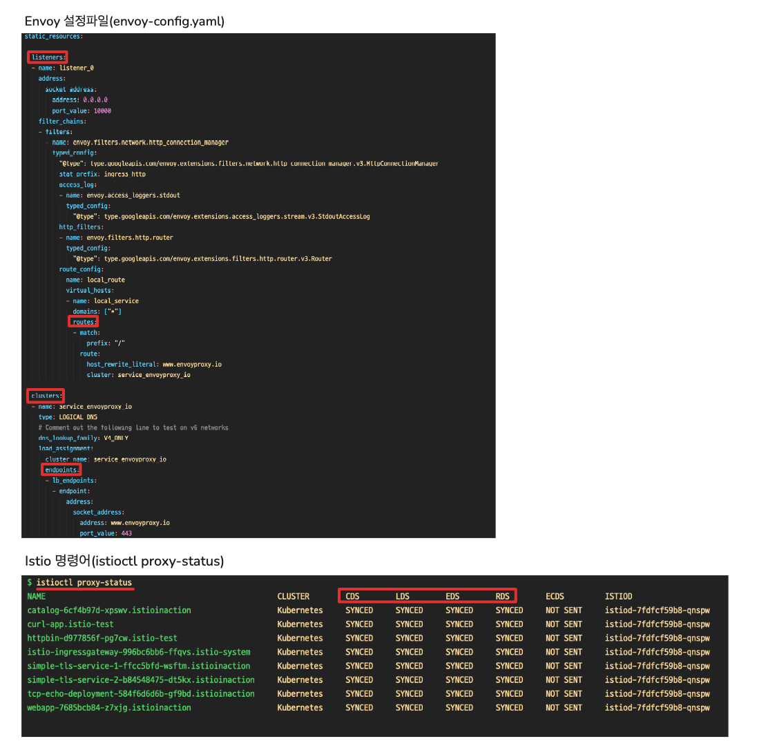 | EDS (Endpoint Discovery Service) | 클러스터 내 엔드포인트(특정 인스턴스)를 관리하여 동적 서비스 발견을 가능하게 합니다.. |