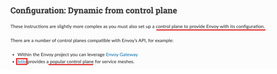 Envoy는 파일 기반이 아닌 컨트롤플레인과의 연결을 통해 동적으로 설정을 주입받을 수 있다. 이때는 Envoy는 이때 Envoy의 핵심 컴포넌트 Istiod와 gPRC기반의 xDS API로 통신하며, 클러스터, 리스터, 라우트 등 설정을 실시간으로 수행한다. Istio는 가장 인기 있는 Envoy의 컨트롤 플레인이라고 소개한다.