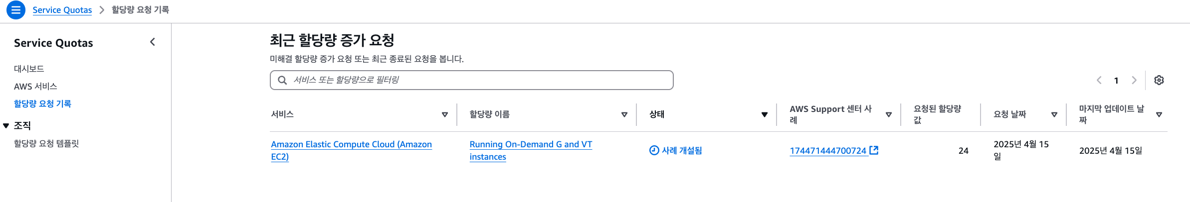 AI 워크로드 실습을 위해서는 EC2 Quota(GPU)가 확보되어야 실습 가능, 요청일이 5일이 지났지만, 쿼터가 증설되지 않아, 추후 실습 예정(GPU 수급 이슈 문제로 인해 지연되는 것 같음)