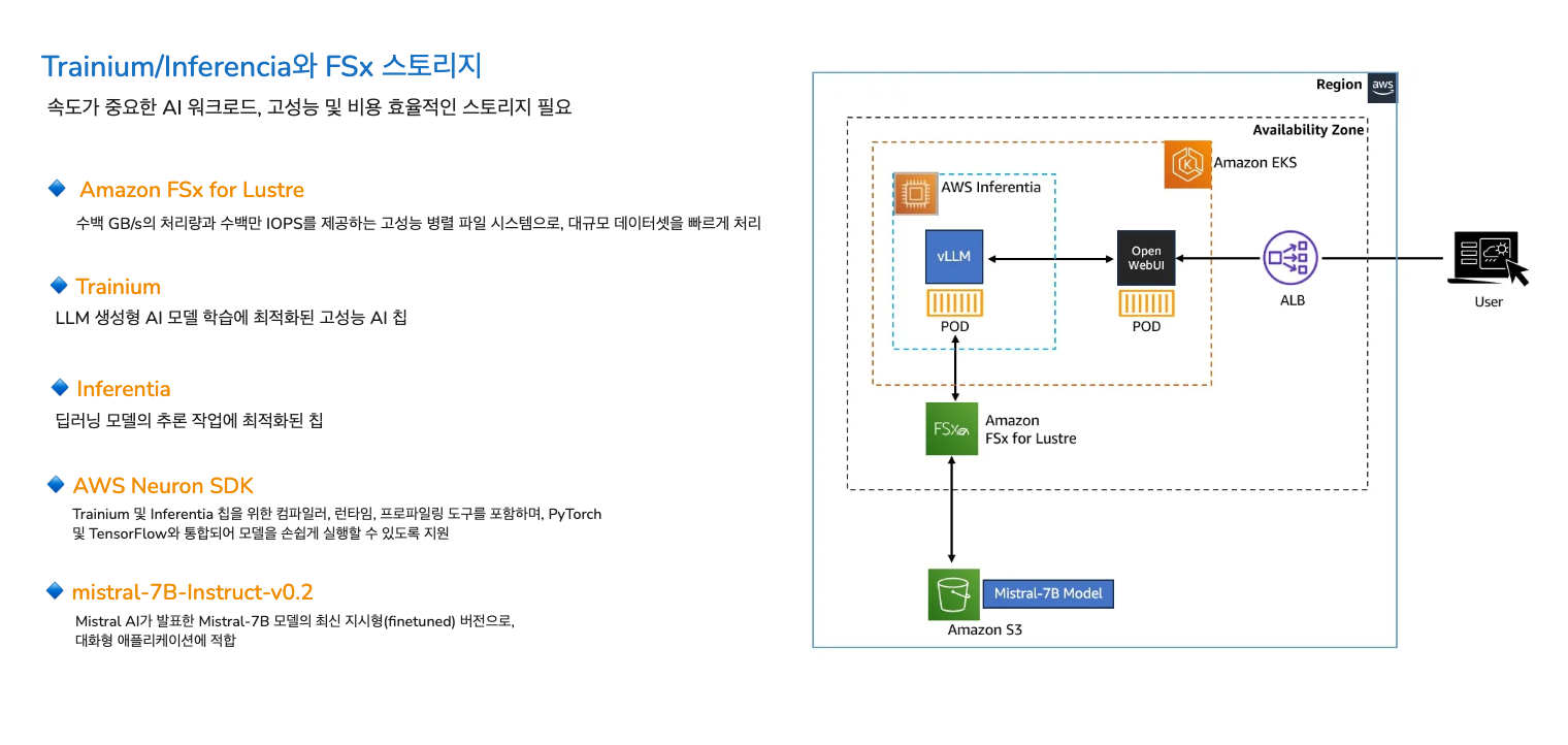 AWS Inferentia Accellertors와 Amazon FSx(고성능 스토리지)와 S3를 활용하여 EKS에서 생성형 AI 챗봇 애플리케이션을 구성해 보자. GenAI with Inferentia & FSx Workshop을 통해 진행한다.