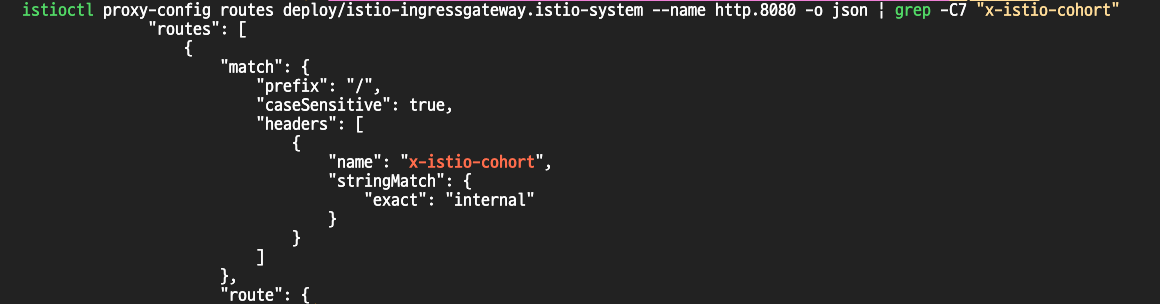 예를 들어, 요청 헤더에 x-istio-cohort: internal 값을 포함시키면,