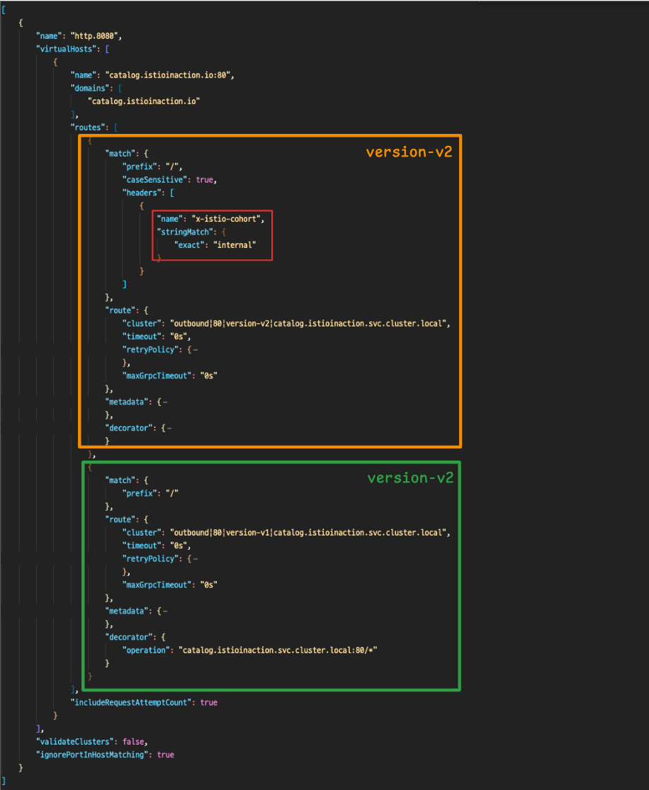 istio-proxy 설정을 확인해 보면, 순서에 따라, 위에서부터 적용되는데, v2에 헤더 매치 설정이 들어갔음을 확인할 수 있다.