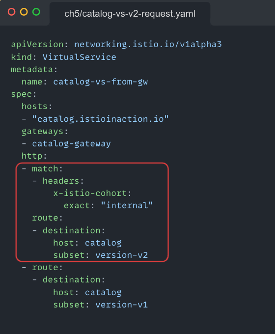 kubectl apply -f ch5/catalog-vs-v2-request.yaml -n istioinaction