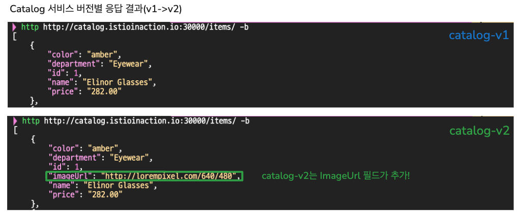 v2 버전의 카탈로그 서비스는 기존 v1에 비해 ImageUrl 필드가 추가된 응답을 반환한다.