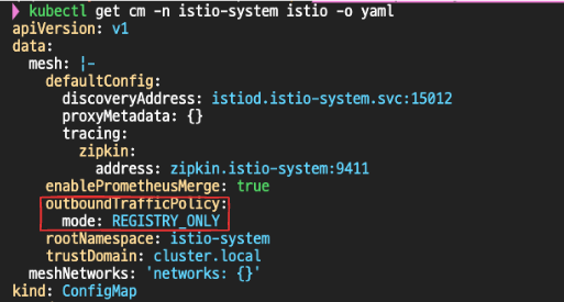 istioctl install --set profile=default --set meshConfig.outboundTrafficPolicy.mode=REGISTRY_ONLY