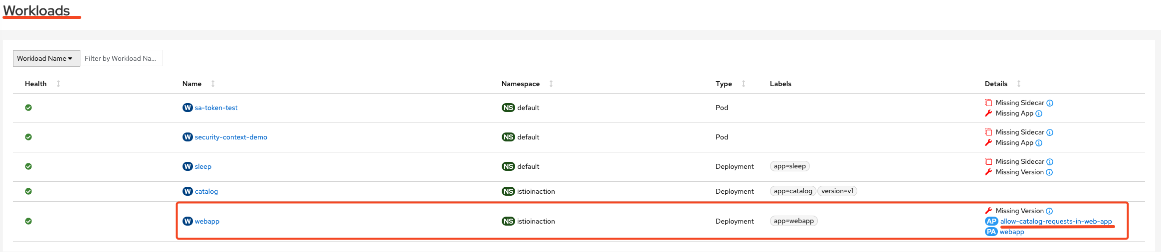 다음 정책은 istioinaction 네임스페이스의 webapp 워크로드에 적용되며,