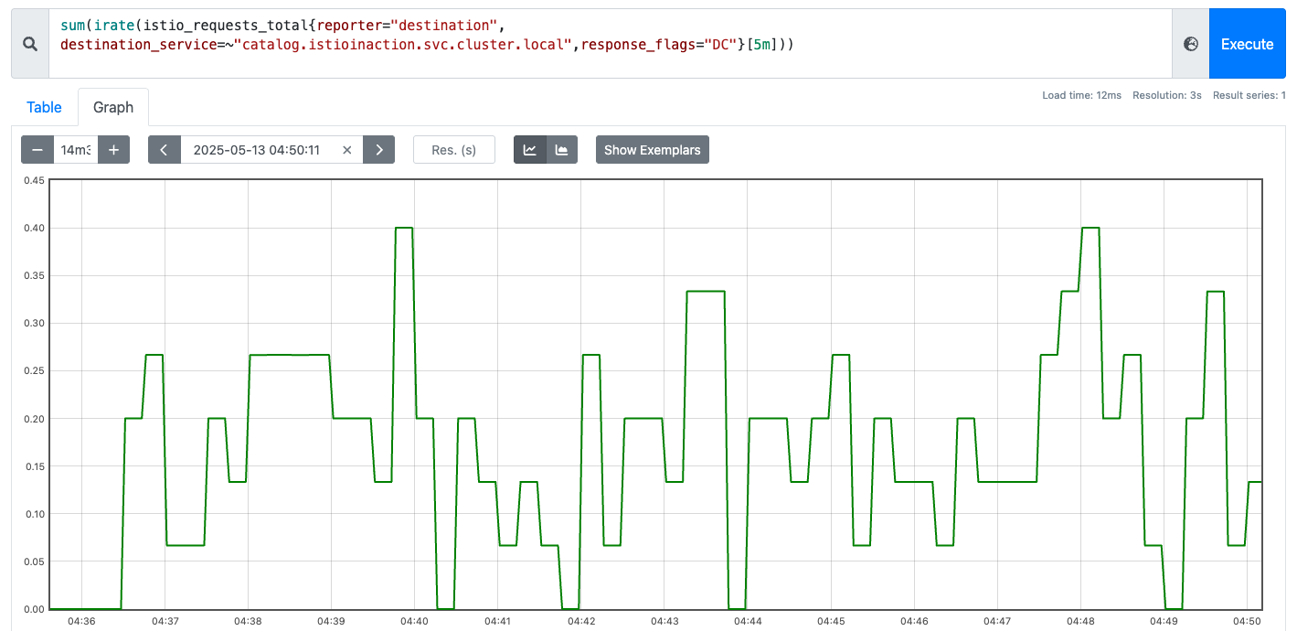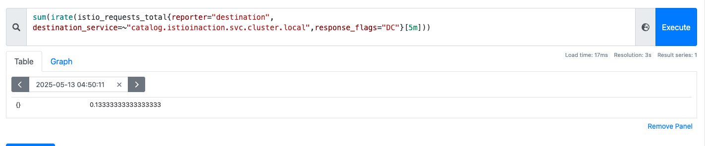 sum(irate(istio_requests_total{reporter="destination", destination_service=~"catalog.istioinaction.svc.cluster.local",response_flags="DC"}[5m])) by(response_code, pod, version)