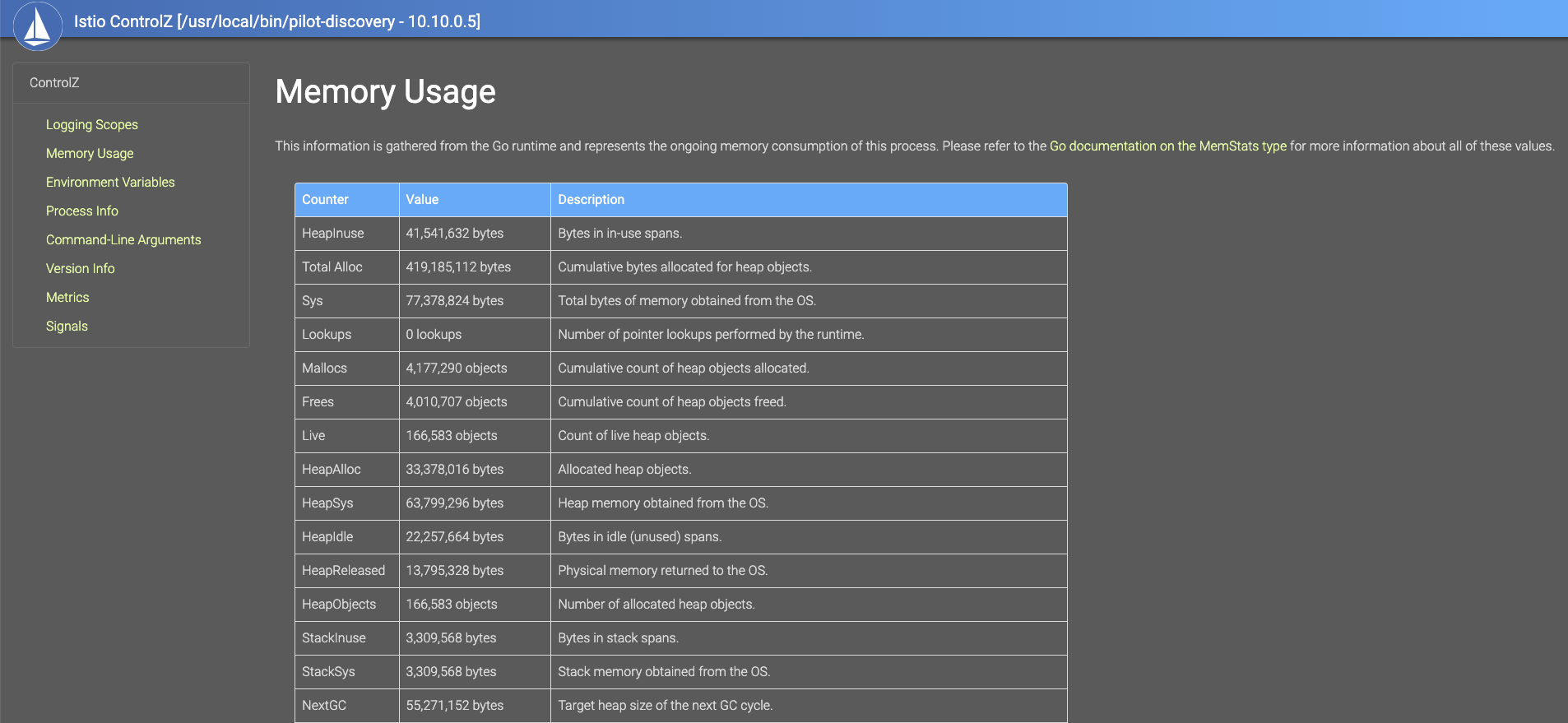 ControlZ는 Istio Pilot 프로세스의 내부 상태를 실시간으로 확인할 수 있는 관리자용 웹 인터페이스다.