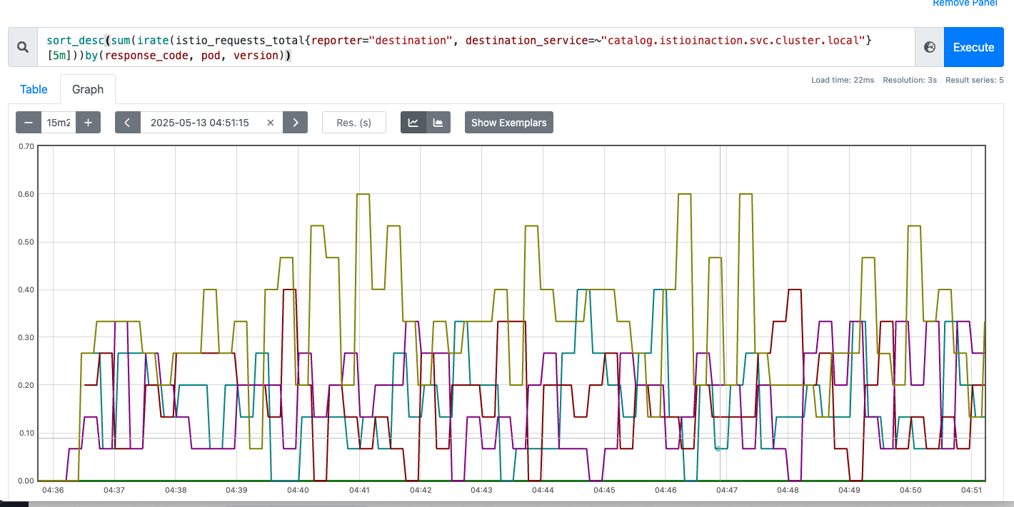 sort_desc(sum(irate(istio_requests_total{reporter="destination", destination_service=~"catalog.istioinaction.svc.cluster.local",response_flags="DC"}[5m]))by(response_code, pod, version))