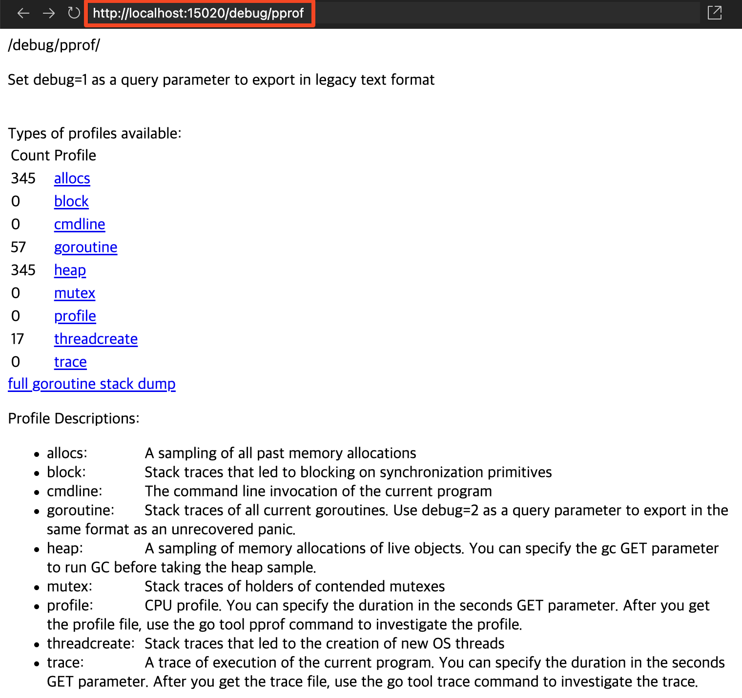 /debug/pprof/* 는 성능 문제, 메모리 누수 등을 디버깅하는 데 도움이 되는 Go 언어 프로파일링 엔드포인트이다.