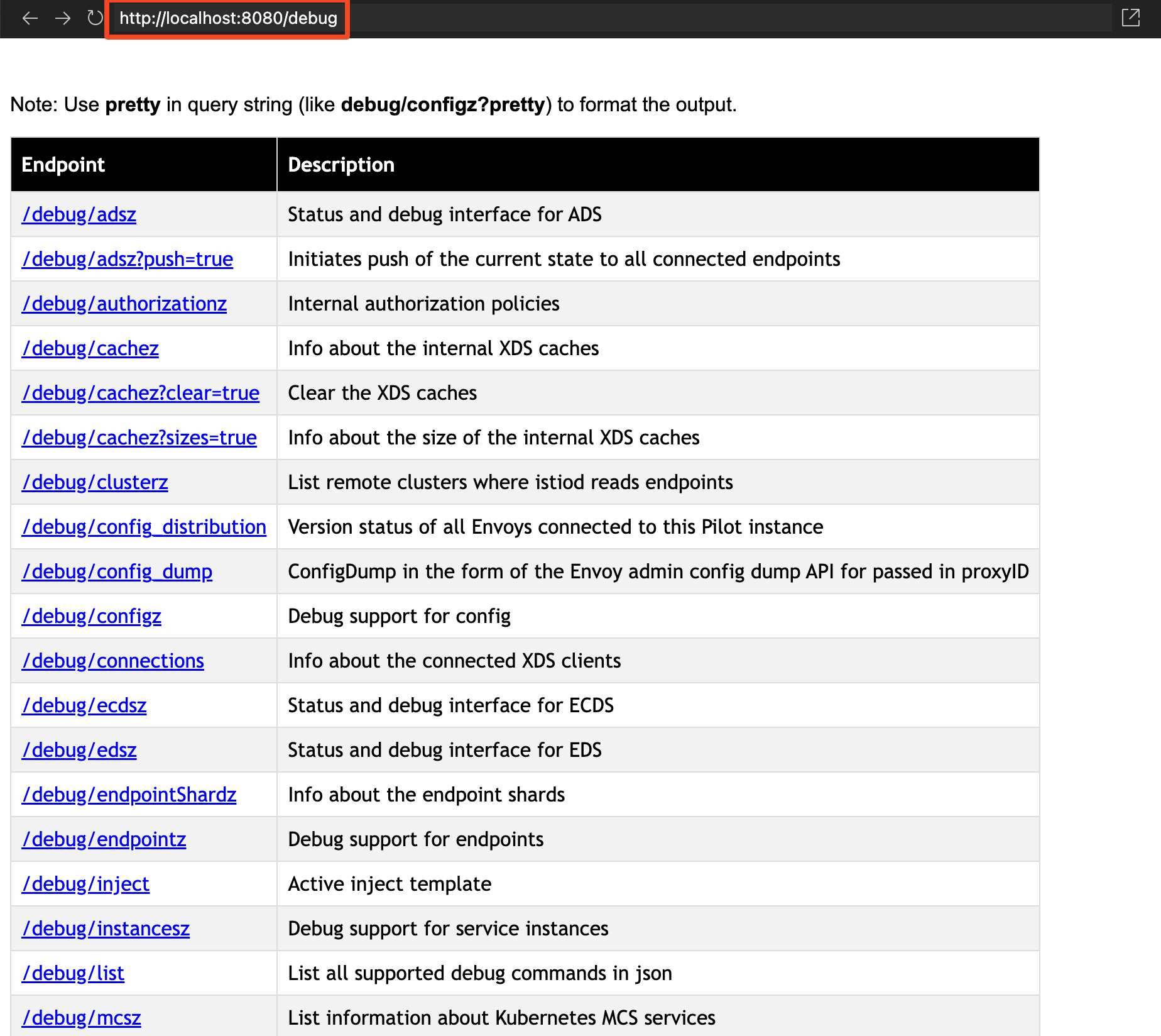 istiod는 아래와 같은 디버그 엔드포인트를 통해 서비스 메시 상태, 정책 정보, 프록시 동기화 상태 등을 상세히 제공한다.