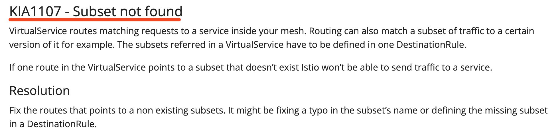 경고 아이콘 위에 마우스를 올리면 KIA1107 - Subset not found와 같은 메시지가 뜬다. 이는 존재하지 않는 subset을 참조하고 있다는 뜻이다. 보통은 DestinationRule에 해당 subset 정의가 누락되었거나, subset 이름에 오타가 있는 경우다.