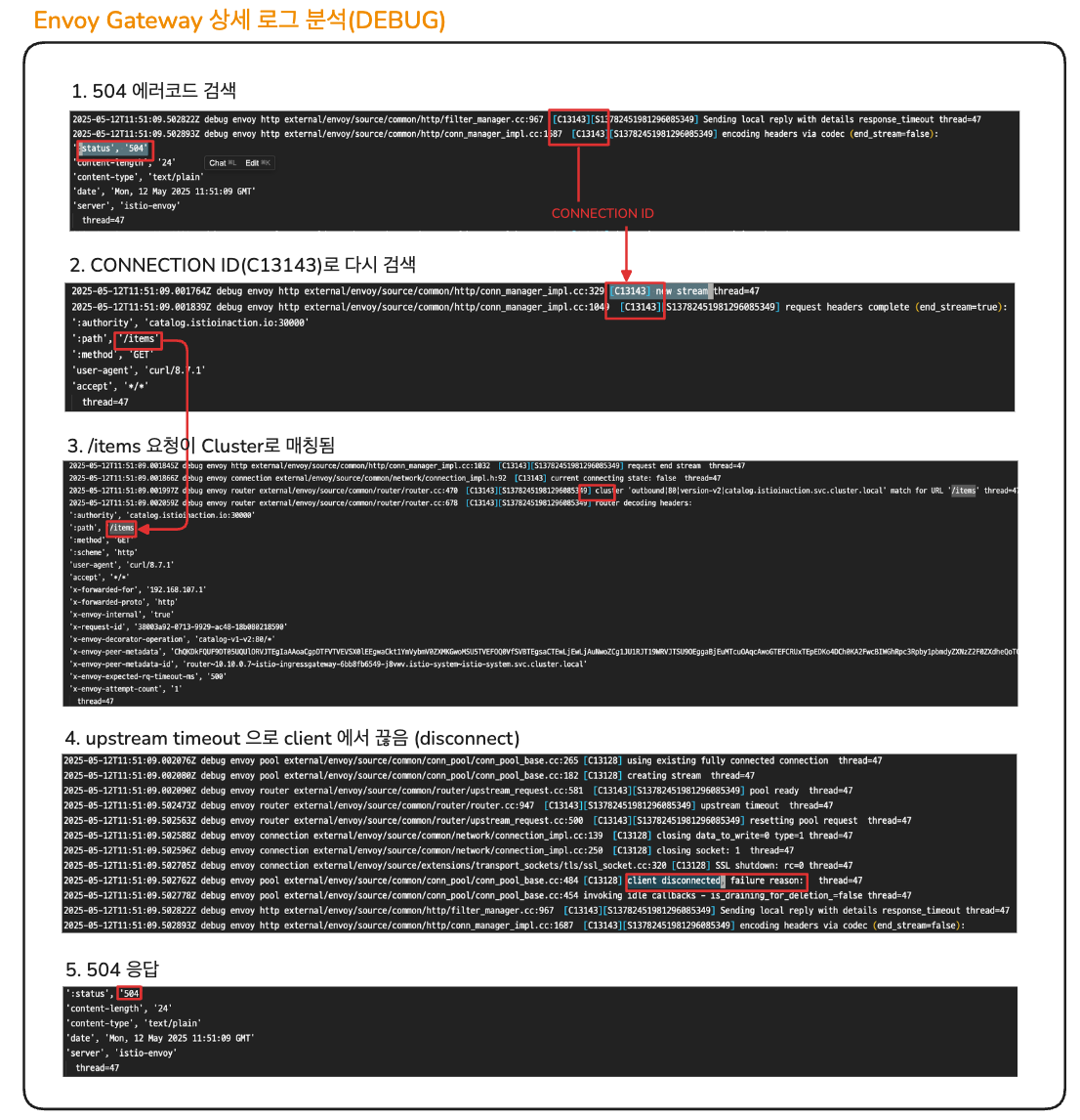 이처럼 Istio에서 발생하는 문제는 표면적인 증상과 실제 원인이 다를 수 있기 때문에, 정확한 흐름을 따라가는 디버깅 방식이 중요하다.