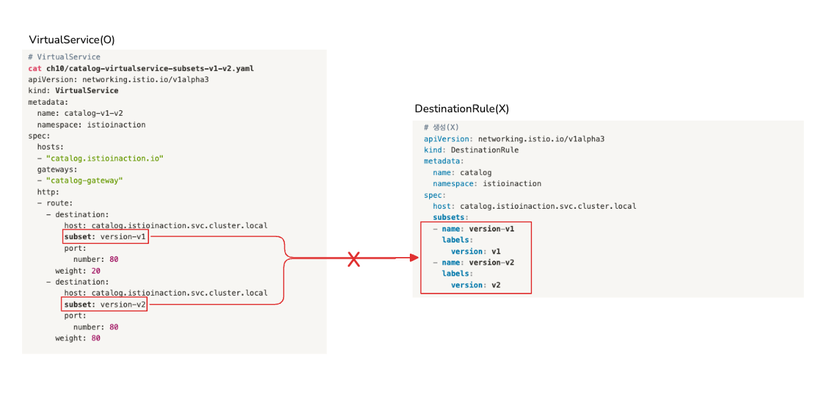 Error [IST0101] (VirtualService istioinaction/catalog-v1-v2) Referenced host+subset in destinationrule not found: "catalog.istioinaction.svc.cluster.local+version-v1"