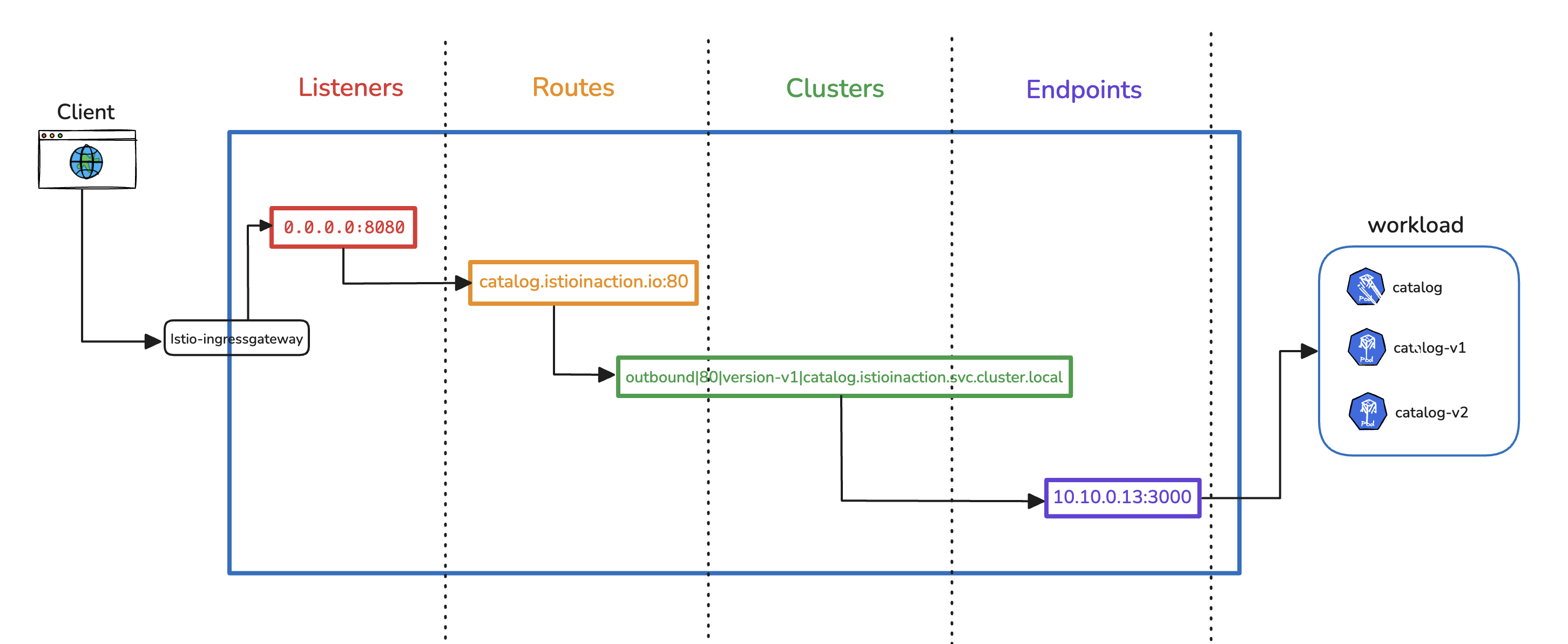 앞서 소개한 다양한 방법으로 디버깅해도 문제가 해결되지 않는다면, Envoy 설정 전체를 수동으로 직접 확인해야 한다. 이때는 Envoy 관리 인터페이스와 istioctl proxy-config 명령어를 조합해 트래픽 흐름의 모든 구간을 점검할 수 있다.
