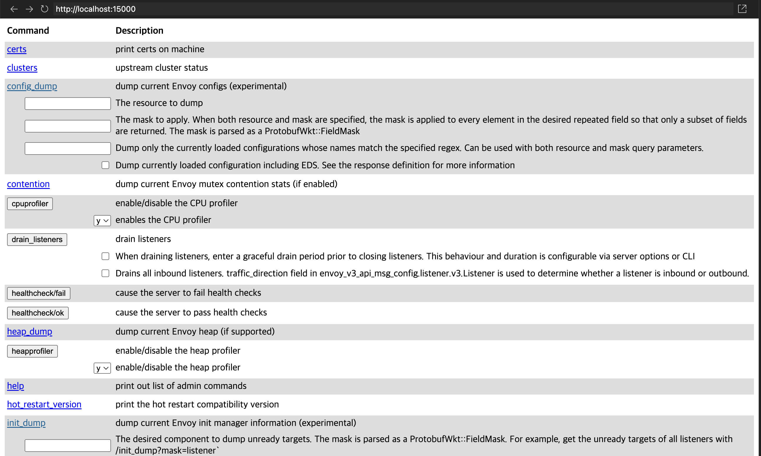 Envoy에는 관리 인터페이스(Admin Interface)가 있으며, 이는 프록시의 내부 설정을 직접 확인하고 일부 상태를 변경할 수 있는 기능을 제공한다. 이 인터페이스는 모든 Envoy 프록시에서 포트 15000을 통해 접근 가능하다.