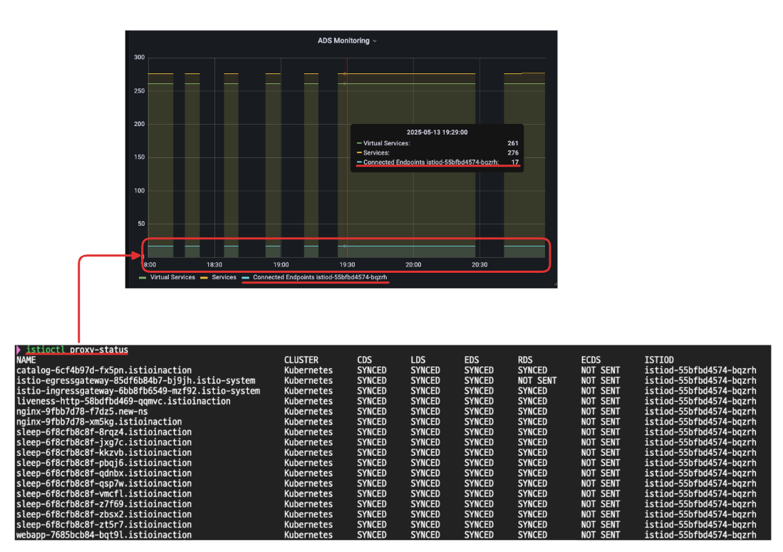 - 각 Istiod 인스턴스가 설정 변경 수신 횟수를 보여준다.