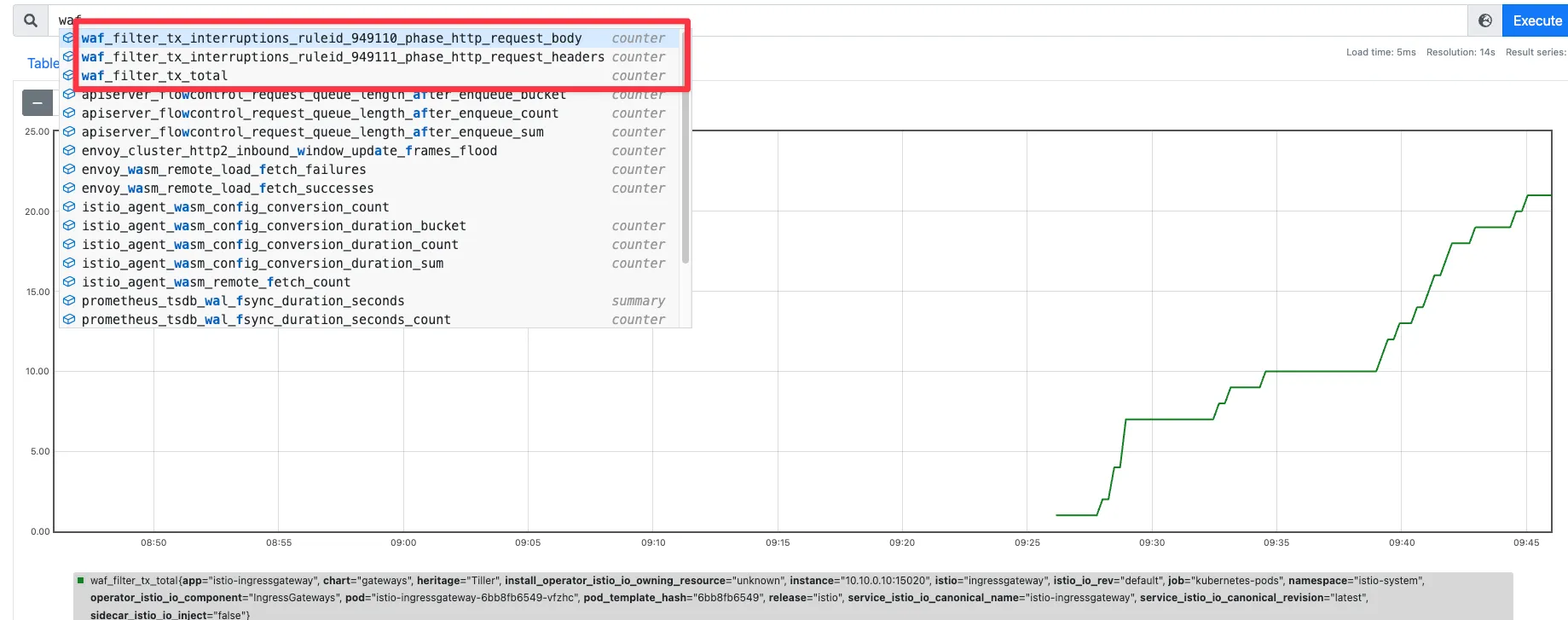 Prometheus 메트릭도 waf_filter로 노출되므로 관측이 가능하다.